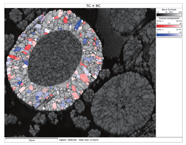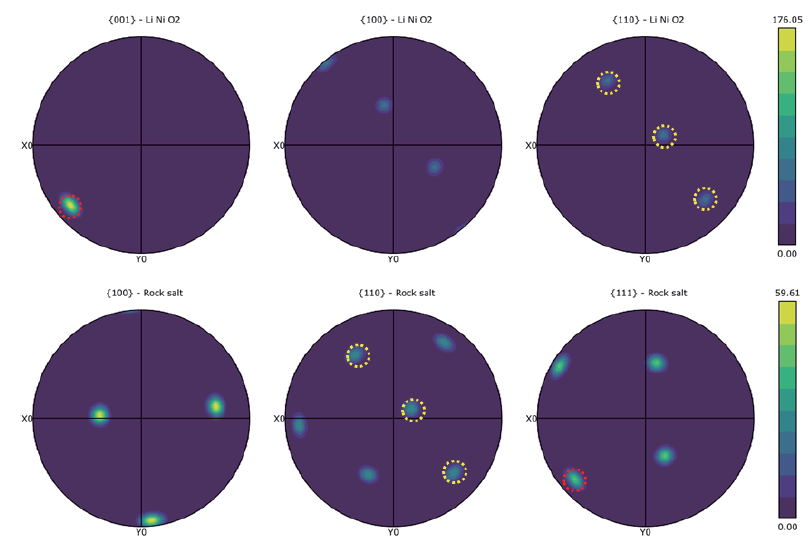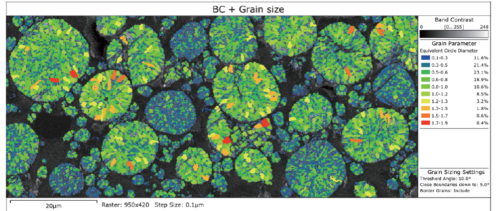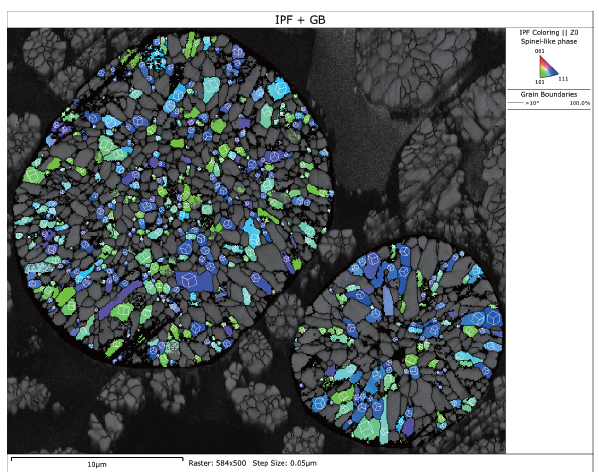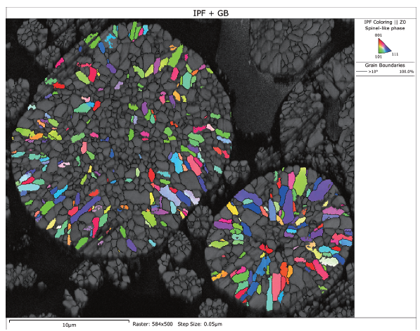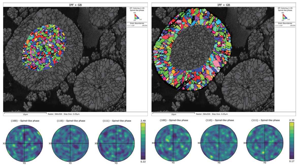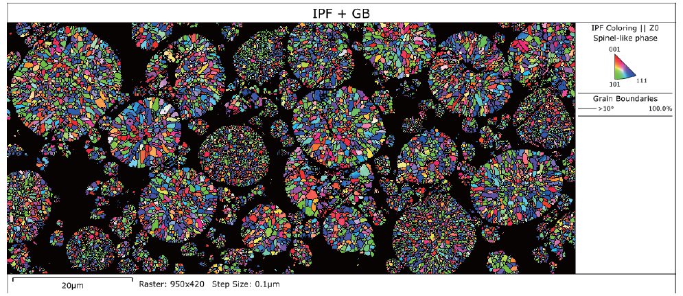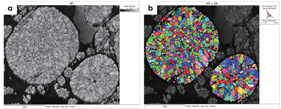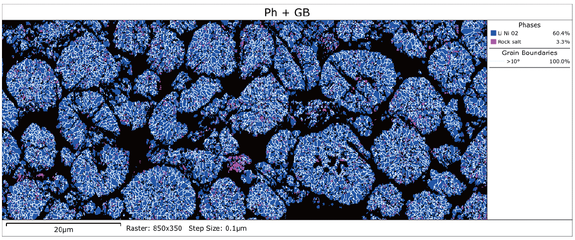 随着研究的深入,科研人员已经不再满足于仅从态上表征正极颗粒。越来越多的研究人员希望建立多晶正极颗粒显微结构和锂离子电池宏观性能之间的关系,而 EBSD 技术正好满足这一尺度表征的要求。EBSD 技术不仅能够分析正极颗粒内晶粒的取向分布,还能可视化地表征充放电循环后岩盐相的分布,与其他表征手段相互补充,拓展了正极材料分析的尺度范围。