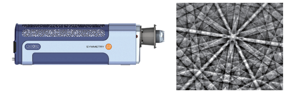 在场发射电子显微镜的束流条件下,正极材料的衍射花样较弱,对 EBSD 探测器灵敏度的要求高。为了增加衍射花样的强度,通常的做法是增加每个像素点上的曝光时间,而此举必然会降低 EBSD 分析的采集速度。所以,文献上报道的 EBSD 分析区域通常较小,或者标定质量不高[1,4]。2017 年,牛津仪器推出基于 CMOS 技术的 EBSD 探测器,该系列 EBSD 探测器的成像系统使用光纤传输耦合 CMOS 传感器技术,具有极高的信号灵敏度。衍射花样的最高分辨率达到 1244 × 1024 像素,如图 2 所示。在同样的电子束条件下,使用更短的曝光时间就可以获得高清晰的衍射花样,随之而来的快速采集和高质量标定使极片尺度上的 EBSD 数据采集成为可能。