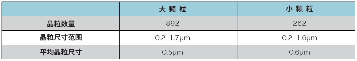 作者使用 50 nm 步长进一步分析了图 5 左上角的两个典型颗粒,结晶形态(图 6 a)和取向分布(图 6 b)清晰地反映了两个颗粒内部晶粒形态的差异。晶粒尺寸统计如表 1 所示,虽然这两个颗粒内部晶粒数量相差比较大,但是颗粒内部晶粒尺寸分布范围、平均晶粒尺寸几乎一致。