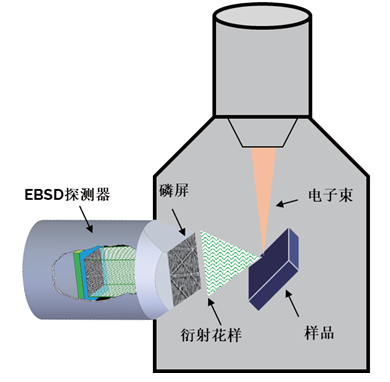 在扫描电子显微镜(SEM)上搭载 EBSD 探测器,电子束照射在倾斜的样品上,背散射电子发生衍射,出射形成的衍射电子投影到 EBSD 探测器的磷屏上,形成衍射花样,如图 1 所示。采集软件解析衍射花样,标定相和取向。设定采集区域,采集软件逐个像素点地采集选定区域的衍射花样,获取采集区域的相和取向数据。之后,后处理软件就可以按照这些数据表达晶粒、界面、取向、织构等各种显微结构的特征。