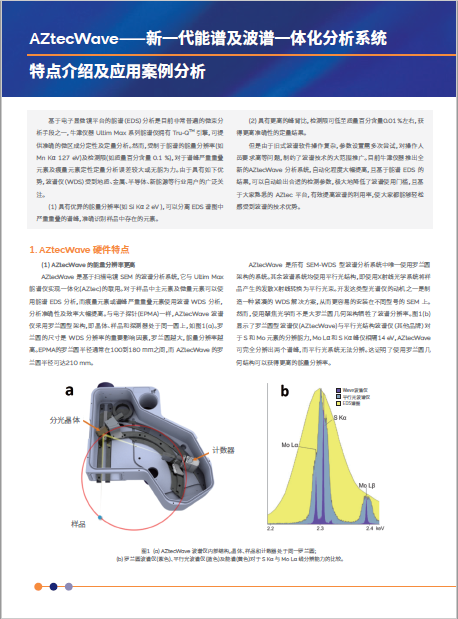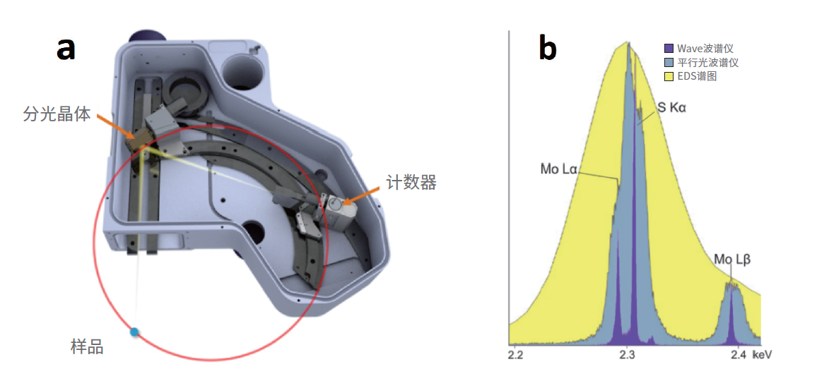 AZtecWave 是所有 SEM-WDS 型波谱分析系统中唯一使用罗兰圆架构的系统。其余波谱系统均使用平行光结构,即使用X射线光学系统将样品产生的发散X射线转换为平行光束。开发这类型光谱仪的动机之一是制造一种紧凑的 WDS 解决方案,从而更容易的安装在不同型号的 SEM 上。然而,使用聚焦光学而不是大罗兰圆几何架构牺牲了波谱分辨率。图1(b) 显示了罗兰圆型波谱仪 (AZtecWave) 与平行光结构波谱仪(其他品牌)对于 S 和 Mo 元素的分辨能力,Mo Lα 和 S Kα 峰仅相隔14 eV,AZtecWave 可完全分辨出两个谱峰,而平行光系统无法分辨。这证明了使用罗兰圆几何结构可以获得更高的能量分辨率。