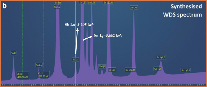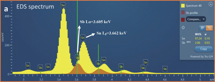 图7是某 Sn-Sb 焊料的 AZtecWave 定量分析结果,其中 Sn 是主要元素(~95%),Sb 是次要元素(~5%)。焊料中添加 Sb 主要为提高强度并防止锡的低温变质。因此为了测试和评估焊料的性能,需要进行准确定量分析。然而 Sn 和 Sb 的特征X射线能量非常接近(Sn Lβ=3.662 keV和Sb Lα=3.605 keV),导致 EDS 谱图中存在明显的峰值重叠(见图7(a))。同时,Sb的含量远低于Sn,利用 EDS 难以实现准确定量。由于 WDS 具有更高的能量分辨率,Sn 和 Sb 的特征X射线可完全分离,如图7(b)。