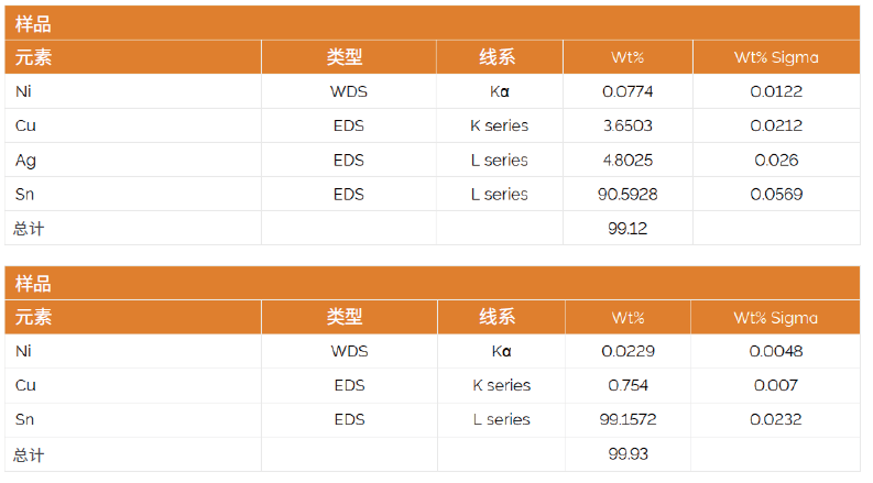 表2是使用 AZtecWave 定量分析 Sn-Ag-Cu 和 Sn-Cu 焊料中微量镍的浓度。添加少量镍(<0.5wt%)可以改变焊料的性能,如减少锡和铜互扩散及孔洞。分析时,痕量的 Ni 元素使用 WDS 分析,其余使用 EDS 分析。表2显示了两个示例结果。两个样品中的 Ni 含量分别为 774±122和 229±48 ppm,表明 AZtecWave 可以轻松区分镍浓度<800 ppm的焊料样品,精度为±50 ppm。