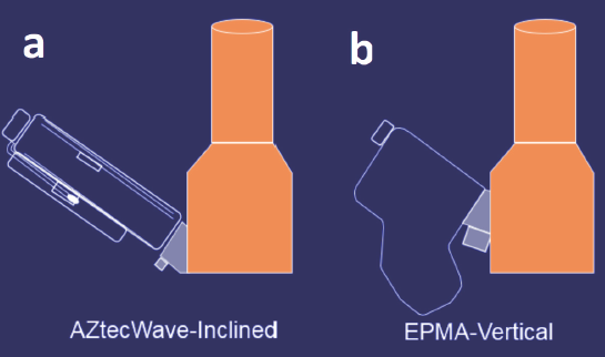 罗兰圆与电子光学系统的相对位置即波谱仪的安装方式,AZtecWave 与 EPMA 也有差异,AZtecWave 为倾斜式安装,而 EPMA 的波谱仪为垂直式安装,如图2。AZtecWave 分析时,信号强度对工作距离并不敏感,如在标准工作距离±0.5 mm时,仍可以获得95%最高强度的信号,因此对于表面不平整的样品,同样可以得到理想的强度。对于平行光波谱仪及 EPMA 而言,信号强度对工作距离及表面平整度较为敏感。此外,AZtecWave 如果安装在场发射扫描电镜上,电子图像的分辨率及效果更佳。