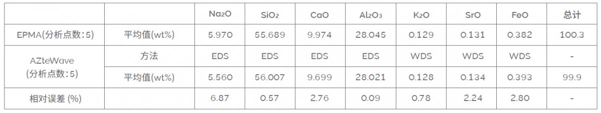 定量结果如表3所示,AZtecWave 检测含量在0.5 %以内的 K2O,SrO 及 FeO 的定量结果与 EPMA 法的非常接近,对于主元素,AZtecWave 虽然使用 EDS 分析,结果仍十分可靠。由于 EDS 采集时间控制在几秒之内,减小了电子辐照引起的 Na 离子迁移,AZtecWave 得到的 Na 的定量结果可能更为可靠。