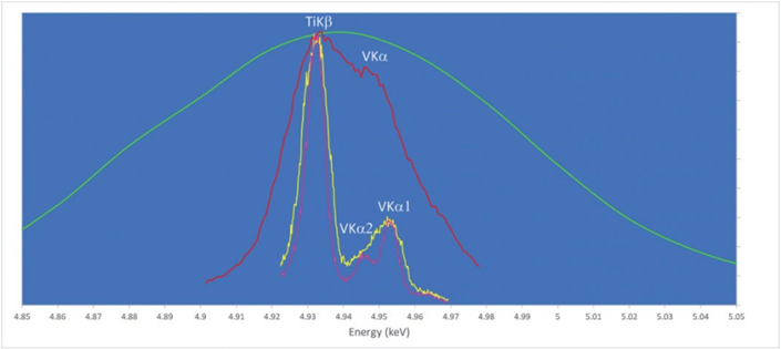 Ti-6Al-4V 合金由于塑性好、具有良好的高温强度(可于400 ℃下长期服役)、抗海水腐蚀能力强,且生产工艺简单,主要应用于飞机压气机叶片、舰艇耐压壳体、大尺寸锻件等。Ti-6Al-4V 中的 Ti Kβ (4.932 keV) 和 V Kα1 (4.952 keV) 的能量差仅为20 eV;考虑到 V Kα2(4.945 keV)的影响,这一差别实际上会更小。对于如此严重的谱峰重叠,很多平行光波谱仪也无能力。如图6为在 Ti-6Al-4V 样品上采集的能谱及三组波谱数据。绿色的能谱谱图无法区分Ti Kβ及V Kα。红色、黄色及紫色波谱谱图是在 AZtecWave 狭缝完全打开,狭缝标准宽度及减小狭缝宽度条件下采集,能量分辨率分别为20eV, 8eV和 6eV。探测器狭缝完全打开下,分辨率较差(类似大部分平行光波谱仪分辨率),V Kα峰并不明显,无法进行准确定量分析。在 AZtecWave 标准分析模式下 (标准狭缝宽度,分辨率≈8 eV),可以观察到清晰的 Ti Kβ 和 V Kα 峰,因此可以进行准确定量分析。通过进一步减小探测器狭缝宽度,可以提高 WDS 的能量分辨率:由8 eV提高至到6 eV上下,因此可以观察到明显的 V Kα1 和 Kα2 峰。