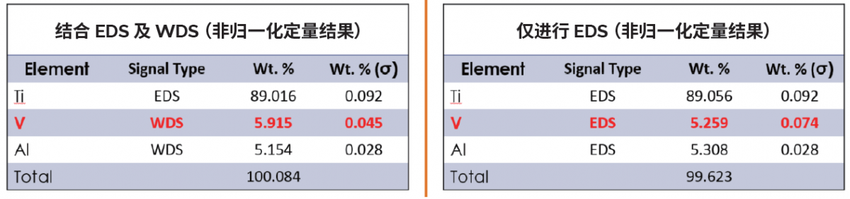 如表1为利用 AZtecWave 对 Ti-6Al-4V 进行定量分析时,主元素 Ti 使用 EDS 分析,V 和 Al 两个元素选择 WDS 分析。无论是 V 和 Al 的定量结果还是总量结果,AZtecWave 结合 EDS 及 WDS 的准确性均优于 EDS 分析的结果。
