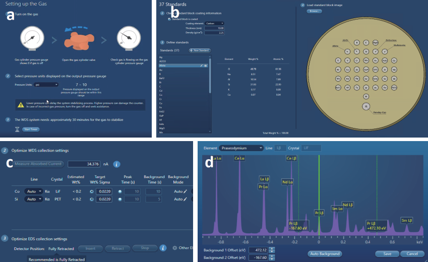牛津仪器 AZtecWave 基于 AZtec 软件平台(集合与 EDS、EBSD 及WDS 于一体),在上述这些问题上进行了一系列的优化。如图3(a),软件会给出 P10 气体的推荐压力及系统稳定时间。用户可根据系统提示,打开或关闭 WDS 与电镜之间阀门,并完成系统检查和束流稳定性测量。在进行 WDS 分析时需采集标准样品信息。如图3(b),AZtec 软件中内置了常用标样(如37及55种组合标样)的成分及相对位置信息,使用 Image Registration 图像导航功能可快速关联标样与真实位置,仅需双击鼠标左键便可定位到感兴趣的区域。在定量分析时,通常要读取或设置的参数包括探针电流、线系、晶体选择、采集时间、前后背底位置及采集时间。以往,采集时需频繁使用法拉第杯测量探针电流,而 AZtecWave 中将样品的吸收电流与探针电流进行了关联,利用吸收电流监控电流稳定性。AZtecWave 中参数设置极为方便,如图3(c),软件自动给出推荐的线系及晶体,并可根据含量、相对误差自动给出谱峰及背底采集时间。当样品成分比较复杂时,用户可以在模拟谱图中可视化手动选择背底,从而避开其他元素的干扰, 如图3(d)。