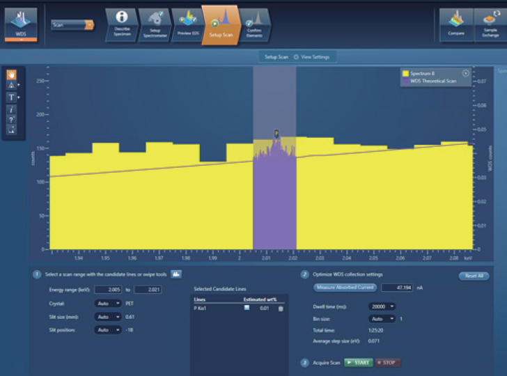 除定量分析外,AZtecWave 可对 EDS 谱图某一能量段进行谱图扫描,从而确认是否存在某种元素或线系。如图5是某钢铁样品中痕量元素P(~100ppm)的谱图扫描。在AZtecWave中输入候选元素线系P Kα线及预期质量百分含量0.01%,软件将自动生成如晶体、狭缝位置、宽度、驻留时间等参数。点击开始便可进行对痕量P元素存在与否的确认。