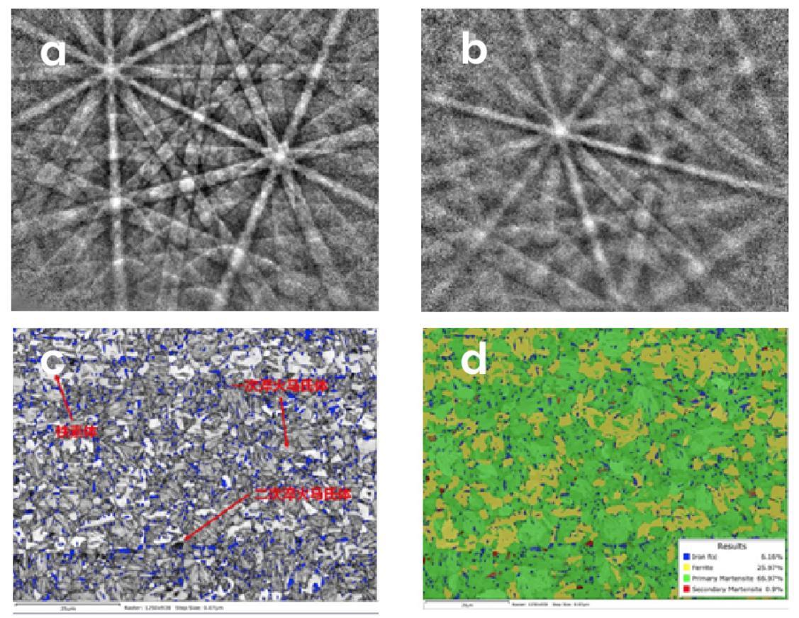 铁素体和马氏体是钢中常见的组织,铁素体为体心立方结构,马氏体为体心正方结构(随碳含量增加正方度c/a增加)。由于马氏体正方度较小,在EBSD分析中,无法利用结构差异与铁素体进行区分。但马氏体由于较高的位错密度及晶格畸变程度引起菊池带质量的退化,如图3(a)和(b)为某铁素体和马氏体晶粒的菊池花样。马氏体花样清晰度较差,可利用衬度图(Band Contrast)斜率图(Band Slope),平均角度偏差图(MAD)等进行表征。牛津仪器EBSD后处理软件AZtecCrystal中Reclassifv(分类)功能可以依据组织中的菊池带衬度、斜率、平均角度偏差的差异自动进行组织识别。如图3(c)为某Q&P(淬火及配分)钢的菊池带斜率图与奥氏体相图的叠加。除蓝色奥氏体相外,斜率图中有灰度明显差异的三种组织亮色的铁素体,暗色的一次马氏体和黑色的二次淬火马氏体。图3(d)中相应给出铁素体,一次二次淬火马氏体及残余奥氏体的分布及比例。Reclassify功能也可用于钢中贝氏体组织鉴定及回复再结晶组织等区分。