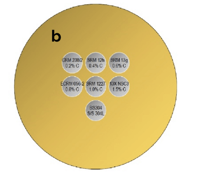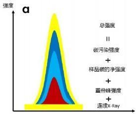 碳含量的异常结果主要是由微束分析中的碳污染造成的,其主要来源可能包括:(1)样品室有机气氛;(2)导电胶排出气体;(3) 样品表面污染等如图2(a)为某样品EDS/WDS/EPMA分析时碳峰强度的来源,总强度包括样品中碳的净含量污染、重叠峰干扰及连续X射线强度。虽然牛津仪器AZtec软件利用Tru-QTM技术可以精确的剥离重叠峰并扣除连续X射线的影响,但碳污染的影响无法彻底消除。国标GB/T 15247-2008微束分析-电子探针显微分析测定钢中碳含量的校正曲线法,等同采用ISO 16592:2006)中介绍了使用电子探针(波谱仪)检测钢中碳含量的方法,即使用系列碳标样建立校正缺陷并进行碳含量的定量分析。利用该标准的难点或者局限性主要有:(1)微束分析用系列碳含量标样难以获得(2) 电子探针(波谱仪)分析所用高电压(10-15kV)及大束流下,难以获得亚微米尺度范围的碳含量分布。为此,作者定制了MAC(Micro-AnalysisConsultants Ltd)公司的系列碳含量微束分析标样,如图2(b)。7个标样,碳含量范围O-1.5%,详情见http://www.51haocaicn/product-1814.html。与该标准类似,使用生津仪器