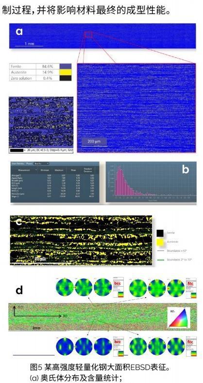 EBSD探测器及大面积拼接功能(LargeAreaMapping)可快速获得宏观尺度范围内的奥氏体含量、分布、晶粒大小织构等信息。图5(a)为某高强轻量化钢板纵截面EBSD相分布图,分析范围6.6mm*0.9mm,采集点数近4千万。SymmetryS2探测器可获得4500点/秒以上的极限采集速度,该样品可在数小时内完成,同时可获得奥氏体相叠加图。绿色区域表征了存在较大残余应力的铁素体晶粒内的亚结构(或位错),这些位错来自于相变或变形过程,不含有亚晶的晶粒已经发生了再结晶。可进一步通过极图对不同区域的织构进行表征,如图5(d)。对于铁素体,纵截面样品中心区域具有较强的1110k1-10>及较弱的[111K1-10>板织构(也叫轧制织构,晶面平行于轧面,晶向平行于轧向的织构)。而在靠近上表面及下表面区域,[110l<1-10>及[111]<1-10>织构较弱,另外还存在[110l<1-12>织构。织构的类型与强度与板材的轧制及退火工艺息息相关,可以用于表征轧制过程,并将影响材料最终的成型性能。