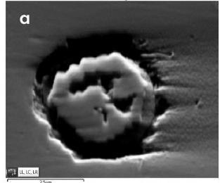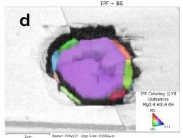 基于前文提到的牛津仪器能谱仪准确的定量分析及EBSD 的Phase ID功能可对钢中夹杂物进行成分分析及相的鉴。如图6(a),为某马口铁样品(钢包精炼钙处理)中的夹杂物形貌,考虑到夹杂物尺寸较小,使用12kV 进行EDS 面分析,可确认为Mg-Al 氧化物和Ca-S 复合夹杂物,利用AZtec准确的定量分析可得Al-O-Mg 原子比为6.1:10.2:1(如图6(b))。EBSD 可进一步确认该复合夹杂物物相及晶粒等信息。在相同的12kV 电压条件下,可确定该复合夹杂物心部为单个晶粒尖晶石结构Mgo₄Al₂4O₄ 相, 外层为CaS 相,平均晶粒尺寸400nm, 如 图 6(c)和 (d)。EBSD 所得物相结果与EDS 定量结果相吻合。EDS-EBSD 结合分析该夹杂物有助于了解炼钢钙处理过程中钙与镁铝尖晶石夹杂物的反应机理,同时帮助了解钙处理过程中的与硫元素的反应过程。