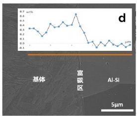 大面积ultim Max170能谱仪同样可以建立类似校正曲线。分别在高电压(20kV)与低电压(5kV)下建立标样碳含量与表观浓度的校正曲线,均展现了良好的线性关系,如图2(c)。5kV条件下电子束在钢铁样品中的扩展仅100nm左右,约为20kV条件下的1/10,可用于亚微米尺度范围内的碳含量定量分析。如图2(d)为某带有AL-Si镀层的热成型钢样品,基体碳含量约0.22%,在基体与镀层界面处有一层亚微米的富碳区,5kV条件下可获得基体至镀层区域的碳含量的定量变化。