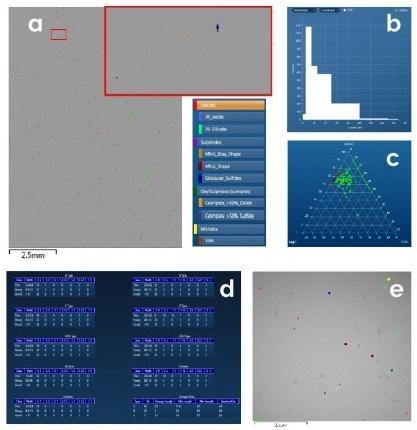 夹杂物的控制是洁净钢生产的关键所在,对 夹杂物的统计分析需要了解其类别、尺寸、变形 程度、成分、分布等信息。对夹杂物统计分析通常 依据GB/T 10561-2005 钢中非金属夹杂物含 量的测定标准评级图显微检验法,该方法为光学 显微镜分析法,无法获得成分信息,且对于小尺 寸夹杂物的分辨力不足。利用牛津仪器的AZtec Steel钢铁夹杂物分析系统,可在SEM-EDS 系统 中实现夹杂物自动分析,可分析低至纳米尺寸析 出相颗粒,在获得形貌信息同时,得到成分信息。 图7(a)表征了某样品中夹杂物依据其成分类别的 分布情况,进一步可获得夹杂物的统计图表及三 元相图等信息,如图7(b)和7(c)。AZtecSteel系统 支持行业主流标准,如GBT 30834, ASTM E2142,DIN 50602,ISO 4967,倍耐力标准等。 图7(d)为输出的夹杂物评级结果。对于纳米尺寸的析出相,可将AZtecSteel系统与TEM 结合,如 图7(e)为某析出相复型样品在TEM 下的识别,平 均尺寸仅30nm。