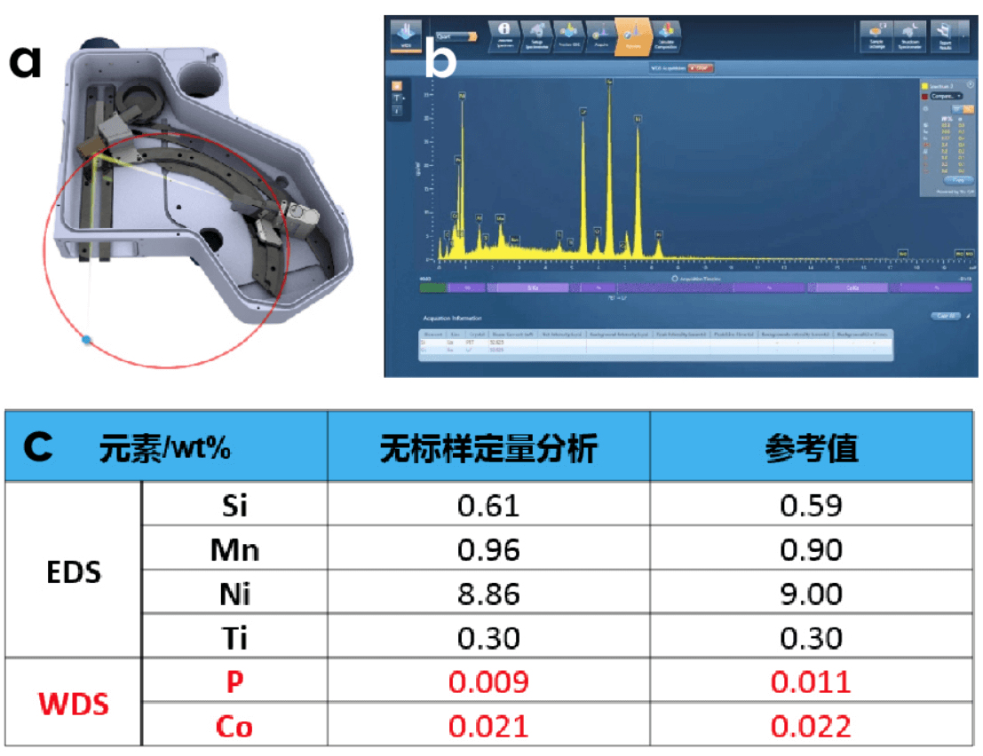 如表1为某低合金钢样品在20kV条件下的无标样定量结果,低于1%含量的各合金元素均展现了优异的定量准确性。然而能谱分析技术的检测限约为质量百分含量0.1%,若希望检测低于或接近检测限的元素含量时,则需要波谱仪(WDS),通常WDS的检测限为0.01wt%。牛津仪器于2020年推出全新的波谱系统AZtec-Wave,该系统采用罗兰圆架构,如图1(a)所示,拥有与电子探针相仿的能量分辨率与定量准确性。同时,AZtec-Wave软件系统与能谱分析处于相同的AZtec软件平台,如图1(b),实现了EDS及WDS有效联用在定量分析时,主元素及微量元素可采用EDS分析,而痕量元素,如图 1(c)表中的P和Co,含量仅0.01%和0.02%,可以采用WDS分析。如此,在保证定量准确性的前提下,极大提高了检测效率。