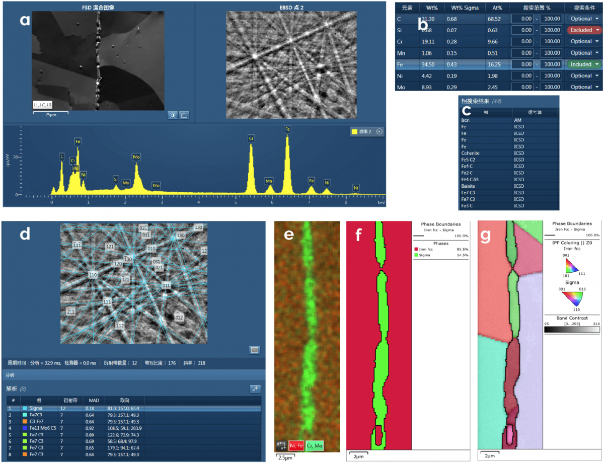 钢铁材料EBSD分析的前提是准确的物相鉴定尤其是对析出相的鉴定。 牛津仪器AZtec软件中的PhaseID(物相鉴定)功能结合EDS与EBSD技术优势,可快速而准确的确认物相。如图4(a)为某奥氏体不锈钢界面处的串状析出相,宽度2微米左右在EBSD分析条件下(20kV电压,样品台倾斜70)对析出相进行点分析,获得该分析点的EDS谱图定量结果以及菊池花样。利用图4(b)的元素种类及定量结果在EBSD数据库中进行初次筛选。可使用搜索条件(optional,Include,exclude)及搜索范重(元素定量范围)进一步优化搜索范围(如图4(c))。之后利用菊池花样在一次检索的结果中进行二次检索,如图4(d),可确认该相为OINA Steel Database数据库中的Siama相,(OINA Steel Database数据库为钢中常见物相的数据库)。随后可对该区域进行EDS-EBSD面分布分析,获得成分、相及取向的分布,如图4(e)-(g)。