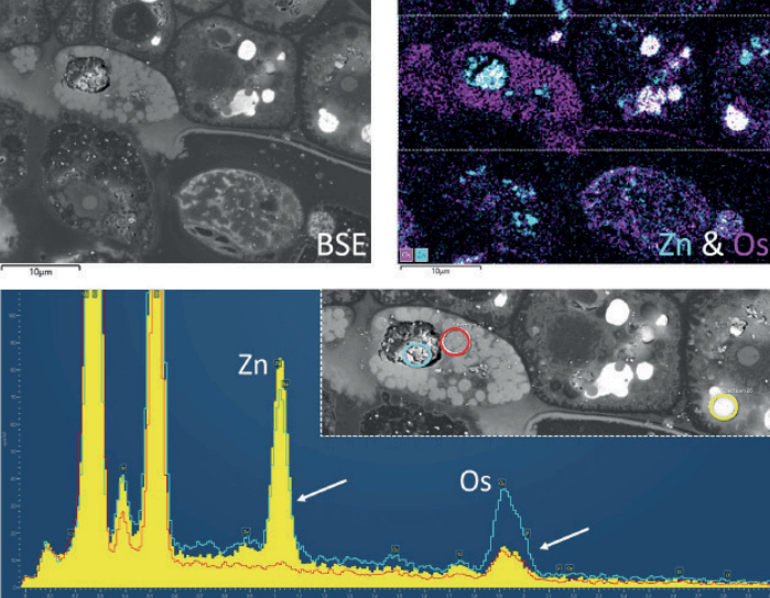 碘化锌锇(ZIO)会将植物细胞的内膜系统和其它细胞器进行染色。EDS可以通过区分Zn和Os的分布来快速鉴别细胞中的不同结构,而无需凭经验通过电子图像灰度差异来人为判断。如图1所示为经过ZIO染色后,Zn和Os在捕蝇草腺体细胞中的分布,可以通过面分布图和谱图清晰地显示不同的囊泡中Zn和Os的含量不尽相同。