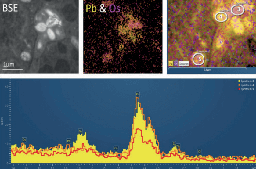 图3所示为玉米根细胞中的Pb和Os分布,通过对比左侧的背散射电子图像可以看出,电子图像中灰度衬度相似的区域,Pb和Os的分布是不太一样的,下面的谱图比较也说明Pb和Os的含量差异。因此,在切片后进行染色并使用EDS分析染色元素的分布是研究新的组织结构以及尝试新的染色方法时的一种重要手段,因为染色可以突出显示超微结构,而不同的结构与不同染色剂的结合能力不同,那么就可以利用染色元素的分布来判断不同组织的超微结构。这也有助于更好地理解样品制备过程和染色规律。