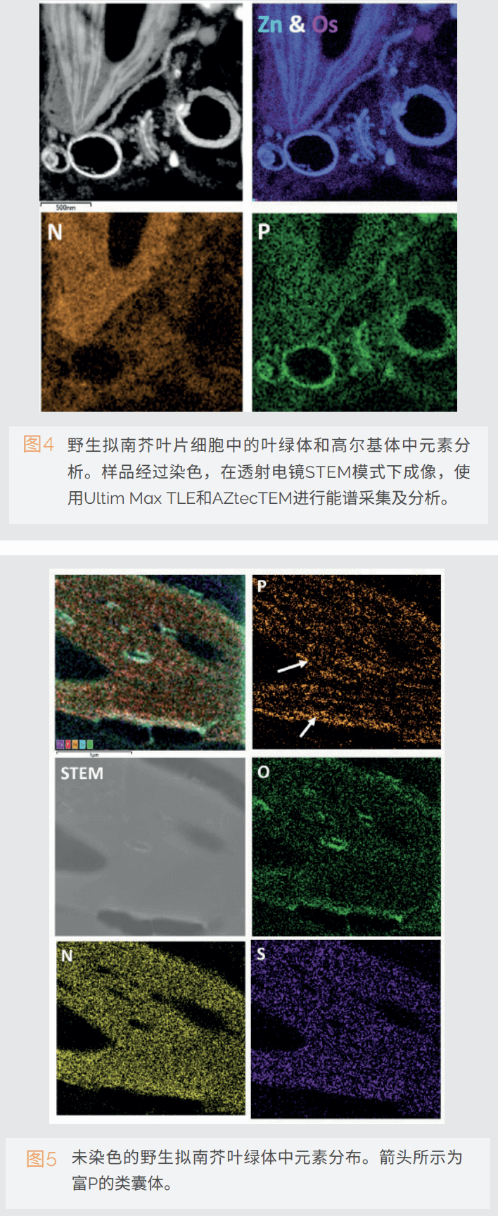 如果样品经过染色,那么EDS可以同时分析染色元素和样本固有元素,得到更加丰富的超微结构与生命体本征元素间的关系,如图4中经过染色的拟南芥叶片细胞中的叶绿体和高尔基体中的元素分布。样品在低真空中采用标准Karnovsky固定液进行固定后用ZIO技术在进行染色,再进行脱水、包埋、切片处理后再TEM 中进行观察分析。