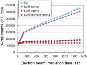图2 不同防污染条件,液氮冷肼(N2),冷肼和等离子清洗联用(N2+Plasma),冷肼和样品台100℃加热联用(N2+Heating)及三者联用(N2+Plasma+Heating)。不同时间下污染程度(碳的信号强度)的比较[2]