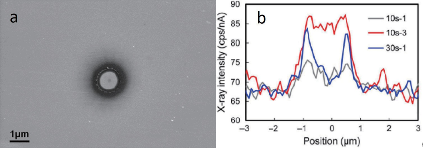 Yuji Tanaka[3]等人利用场发射电子探针,在7kV电压,50nA探针电流,80nm束斑直径条件下于纯Fe样品表面采集10秒(使用液氮冷肼减小污染),而后在SEM中1kV,4mm WD,使用in-Lens探测器拍摄碳污染斑形貌,如图3(a)。样品表面呈现环状污染斑,且中心衬度与基体相似,整个污染区域约3微米。分别进行了三种不同条件的污染:10秒1次(10s-1),10秒3次(10s-3),及30秒1次(30s-1),随后分别使用电子探针线扫描模式对该区域进行分析,如图3(b)。结果污染环区域碳含量高于心部,这与形貌观察的结论相似。