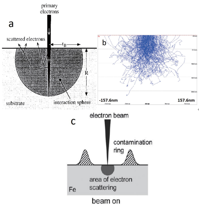 图4 (a) 入射电子束及散射电子束产生碳污染模型[1];(b) 利用Casino软件,蒙特卡洛模型模拟7kV及80nm直径电子束在Fe中的扩展(c)基于图3中染污染情况给出的模型[3]