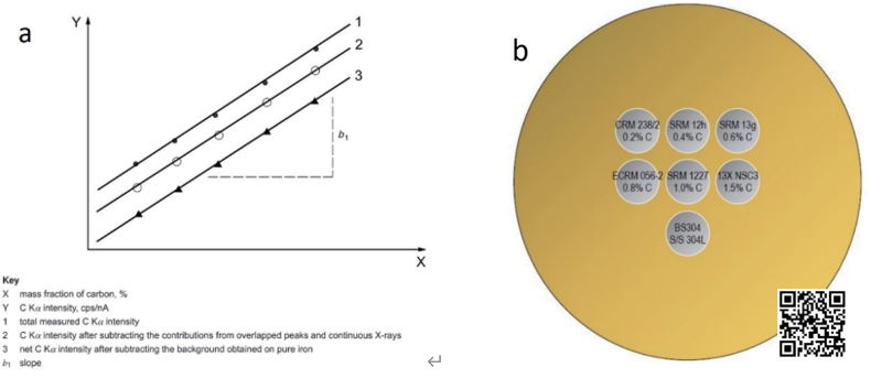 ISO 16592-2012 Microbeam analysis-Electron probe micro analysis-Guidelines for determining the carbon content of steels using a caliberation curve method中给出了波谱法测量钢中碳含量的方法,即校准曲线法。图5(a)为利用系列含碳标样建立碳质量百分含量与C Kα强度的校准曲线。如图中曲线1,只需获得待测样的C Kα强度,便可获知相应的碳的百分含量。由此可知,高质量的微束分析系列含碳标样显得尤为关键,牛津仪器为此从美国Micro-Analysis Consultants Ltd公司定制了碳含量从0.018%至1.429%的7个含碳标样,详情见图5(b)右下角二维码及网址。