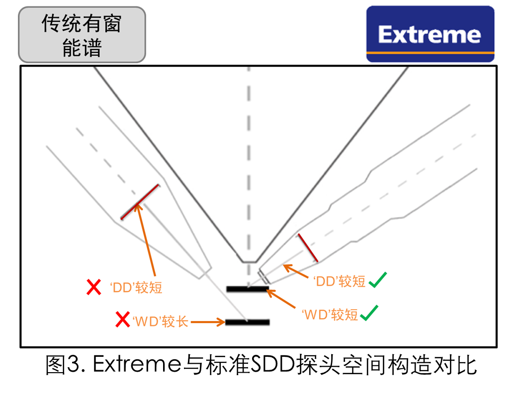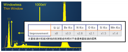 首先,无窗化设计确实极大地提升了特征X射线,尤其是低能端特征X射线的穿透率。相对于传统有窗能谱,Ultim Extreme对轻元素的探测敏感性提高至少3倍,而对极低能的X射线探测敏感性则提高约10倍。