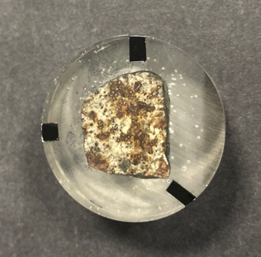 作者近来得到一颗发现于北非的疑似陨石,重约10g,形态如图1所示。疑似陨石呈椭圆形,表面有凹坑,形似气印。表面风化严重,无肉眼可辨的熔壳。通过磁铁吸引可以明显感受到它有磁性。这种磁性特征很容易让人发生误判:有磁性的“陨石”就一定是真的。但是如果陨石中铁-镍金属含量较低,则不会表现出明显的磁性。因此,还需要借助微观分析手段进一步研究。