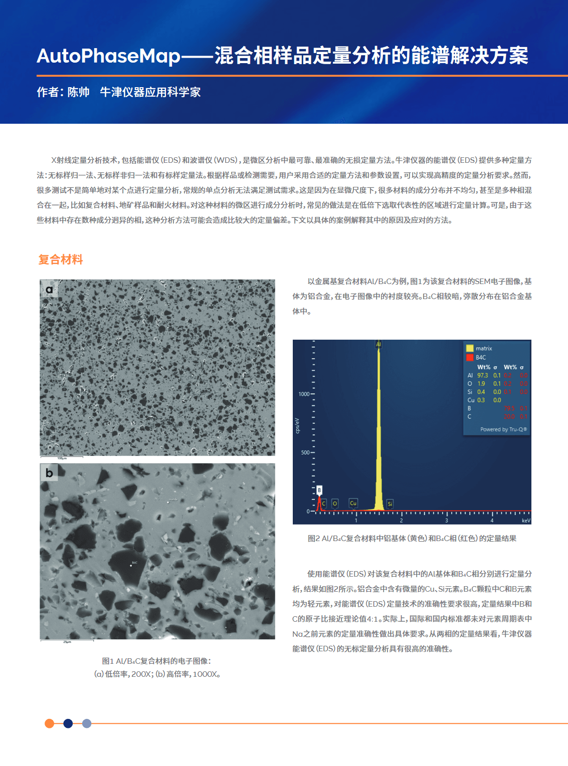 X射线定量分析技术,包括能谱仪(EDS)和波谱仪(WDS),是微区分析中最可靠、最准确的无损定量方法。牛津仪器的能谱仪(EDS)提供多种定量方法:无标样归一法、无标样非归一法和有标样定量法。根据样品或检测需要,用户采用合适的定量方法和参数设置,可以实现高精度的定量分析要求。然而,很多测试不是简单地对某个点进行定量分析,常规的单点分析无法满足测试需求。这是因为在显微尺度下,很多材料的成分分布并不均匀,甚至是多种相混合在一起,比如复合材料、地矿样品和耐火材料。对这种材料的微区进行成分分析时,常见的做法是在低倍下选取代表性的区域进行定量计算。可是,由于这些材料中存在数种成分迥异的相,这种分析方法可能会造成比较大的定量偏差。下文以具体的案例解释其中的原因及应对的方法