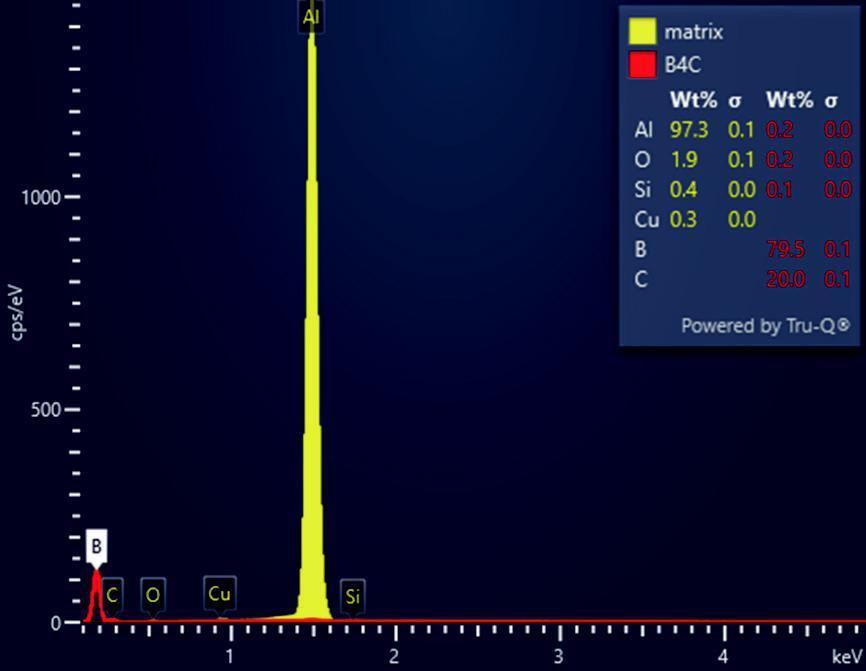 使用能谱仪(EDS)对该复合材料中的Al基体和B4C相分别进行定量分析,结果如图2所示。铝合金中含有微量的Cu、Si元素。B4C颗粒中C和B元素均为轻元素,对能谱仪(EDS)定量技术的准确性要求很高,定量结果中B和C的原子比接近理论值4:1。实际上,国际和国内标准都未对元素周期表中Na之前元素的定量准确性做出具体要求。从两相的定量结果看,牛津仪器能谱仪(EDS)的无标定量分析具有很高的准确性。