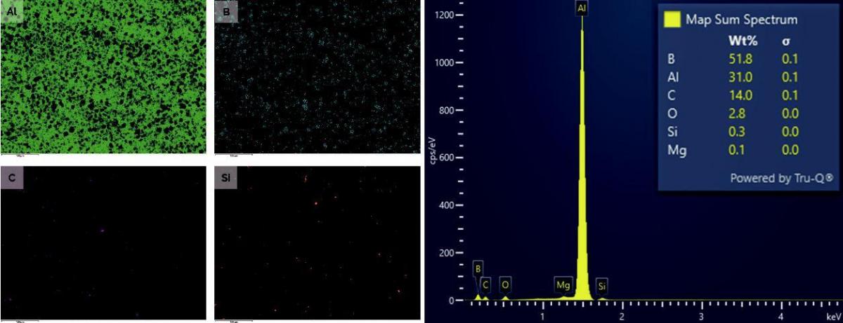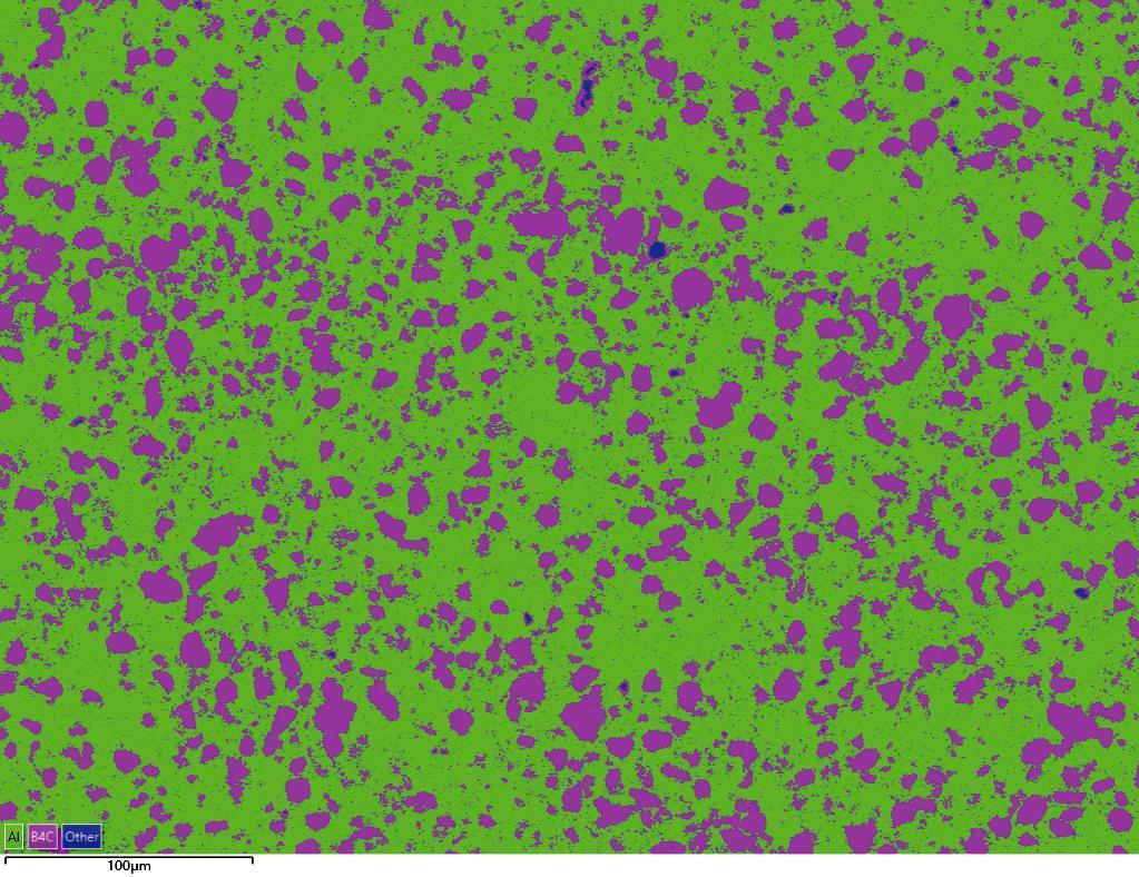 在图3元素分布的基础之上进行AutoPhaseMap分析,得到的相分布如图4所示。相分布和图1(a)中衬度的差异、图3中元素分布一致。统计显示,该区域内Al基体和B4C的面积占比分别为71.2%、28.8%。查阅公开资料可知,Al和B4C的密度分别为2.7g/cm3、2.5g/cm3。换算后得到Al的含量约为72.7wt.%,与预估值(70wt.%)接近,明显高于通过面分析得到的定量结果(31wt.%)。除了这两个相,分析区域内还存在一些富硅的杂质,尽管比例很低(约为0.1%),依然可以被AutoPhaseMap识别出来。