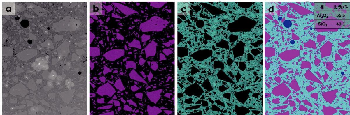 某耐火材料中有两个主相:Al2O3和SiO2,其中Al2O3相的颗粒大,单视场的相分析不具有统计意义。图5为大面积拼接(LAM,Large Area Mapping)的元素分布及AutoPhaseMap分析的相分布。大面积拼接(LAM,Large Area Mapping)功能可将设定区域分割成若干个小区域,逐个区域分析之后合并成一个大区域。该功能可以配置在面分析中,是大范围分析的利器。图5中拼接区域面积约为2cm×3cm,具有足够的代表性。图5(a)中两种相的衬度差异与Al、Si元素(图5b~c)的分布相对应。图5(d)的AutoPhaseMap分析显示,Al2O3和SiO2相的面积比例分别为55.5%、43.1%,孔洞的面积占比约为1.3%。