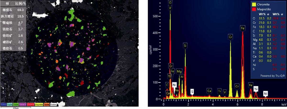 对于相组成复杂的地矿类样品,AutoPhaseMap的相分析也有很好的表现。图6是AutoPhaseMap分析得到的普通球粒陨石中球粒的相分布,左上角给出了各相的面积比。其中橄榄石的比例最高接近70%,其次为辉石,约占19%。陨硫铁占比4.7%。铁纹石、镍纹石的比例分别是1.7%、0.6%。其余的相为铁的氧化物:铬铁矿、磁铁矿。铁纹石和镍纹石的差异在于Ni含量的高低,磁铁矿和铬铁矿的差别在于Cr元素,相区分难度很大。AutoPhaseMap的灵敏性非常高,可以轻易地区分这两组成分接近的矿物。如图7所示,磁铁矿和铬铁矿的谱图和定量结果清晰地显示Cr、V、Ti元素含量在两相在中的差异。