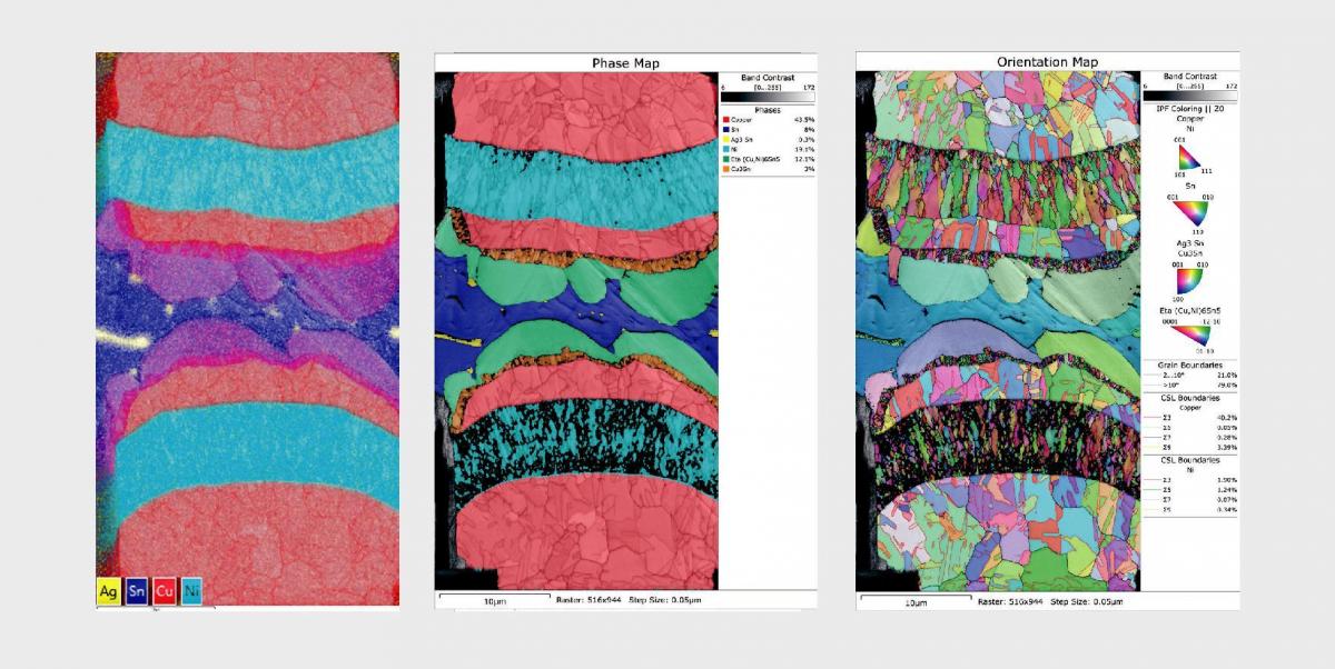 以下是一个铜柱凸点的截面样品,通过EDS和EBSD的同步扫描(总扫描时间为12min)可以获得区域内的元素分布和诸如晶粒尺寸、第二相分布和织构等的结构信息。结果表明,原凸点上的Ni层晶粒沿着互联方向被拉长,两端的焊料帽(Cu)都与Sn盘在反应过程中生成了Cu6Sn5和Cu3Sn两层第二相,其晶粒形貌和尺寸相差巨大;在Sn盘中观察到了少量的Ag3Sn第二相,其形貌和大小均不相同。