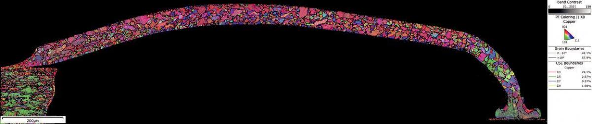 打线是封装过程中的一个关键工序,金属线(通常为Cu,Ag,Au等)的微观结构、其与芯片和引线框架键合截面的结构都会影响键合的强度和电气性能。使用EBSD可以有效地对不同尺度的该结构进行高速表征,提供有关晶粒尺寸、择优取向、局部应力集中以及键合截面析出等显微组织信息。