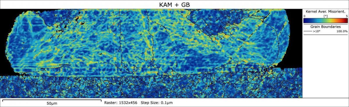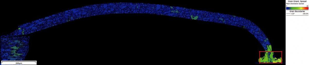 以下案例展示的是打线后从芯片焊盘到引线再到引线框架的大面积EBSD分析,其结果显示,在芯片焊盘与引线键合的界面附近,铜引线的晶粒尺寸长大,局部变形增加。在更高放大倍率下对焊盘-引线键合界面的EBSD分析可以清晰地观察到应力集中的区域及程度,这可能就是键合处剥离的重要原因。